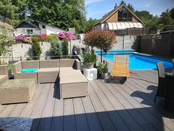 Biete freistehendes Ein- bis Zweifamilienhaus mit Swimmingpool, Sauna und Einliegerwohnung.